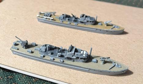 Another deadly foe of the MTBs was the MFP, or “F-lighter ” landing craft used by Germany for coastal resupply primarily in the Mediterranean and the Black Sea/ Baltic fronts. These 170 foot ships carried light and heavy flak weapons in addition to cargo. As the war went on, some were modified into AFP artillery carriers, loosely known by the Allies as “Flaklighters”. These vessels were bristling with 20mm quads, 37mm guns and usually 2 large 3.5 or 4.1 guns. They were very heavily armored with steel and concrete. This armor, however, made them unbalanced, and a few flaklighters capsized from near miss bomb explosions. The MFP/AFP classes were also very hard to torpedo as they only drew about 3-5 feet of water, depending on their loading. Allied MTBs were not effective against these craft until the arrival of the British MkVIII torpedoes in 1944. These were fitted with effective magnetic exploders that detonated the warheads as they passed underneath the shallow draft F-lighters. British MTB flotillas racked up many sinkings of F-lighters with these torpedoes once they arrived.